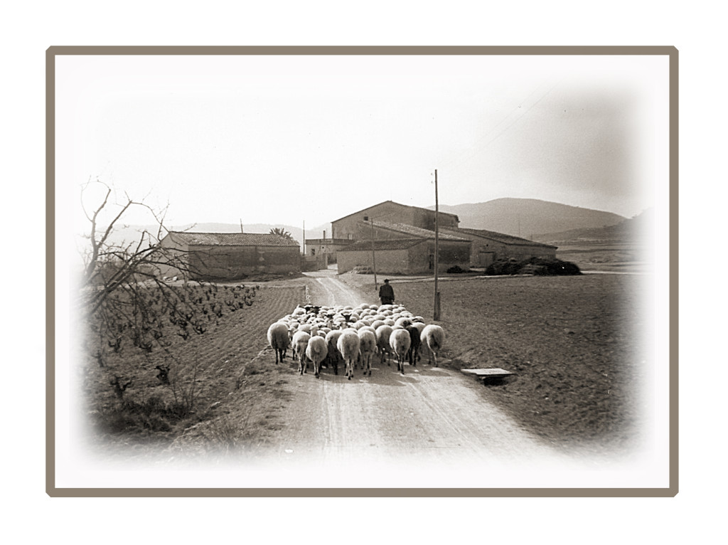 En aquesta fotografia podem veure el ramat d’ovelles a punt d’entrar a la masia de Laverna. A l’esquerra hi ha una vinya i a la dreta un camp de conreu. Hi…